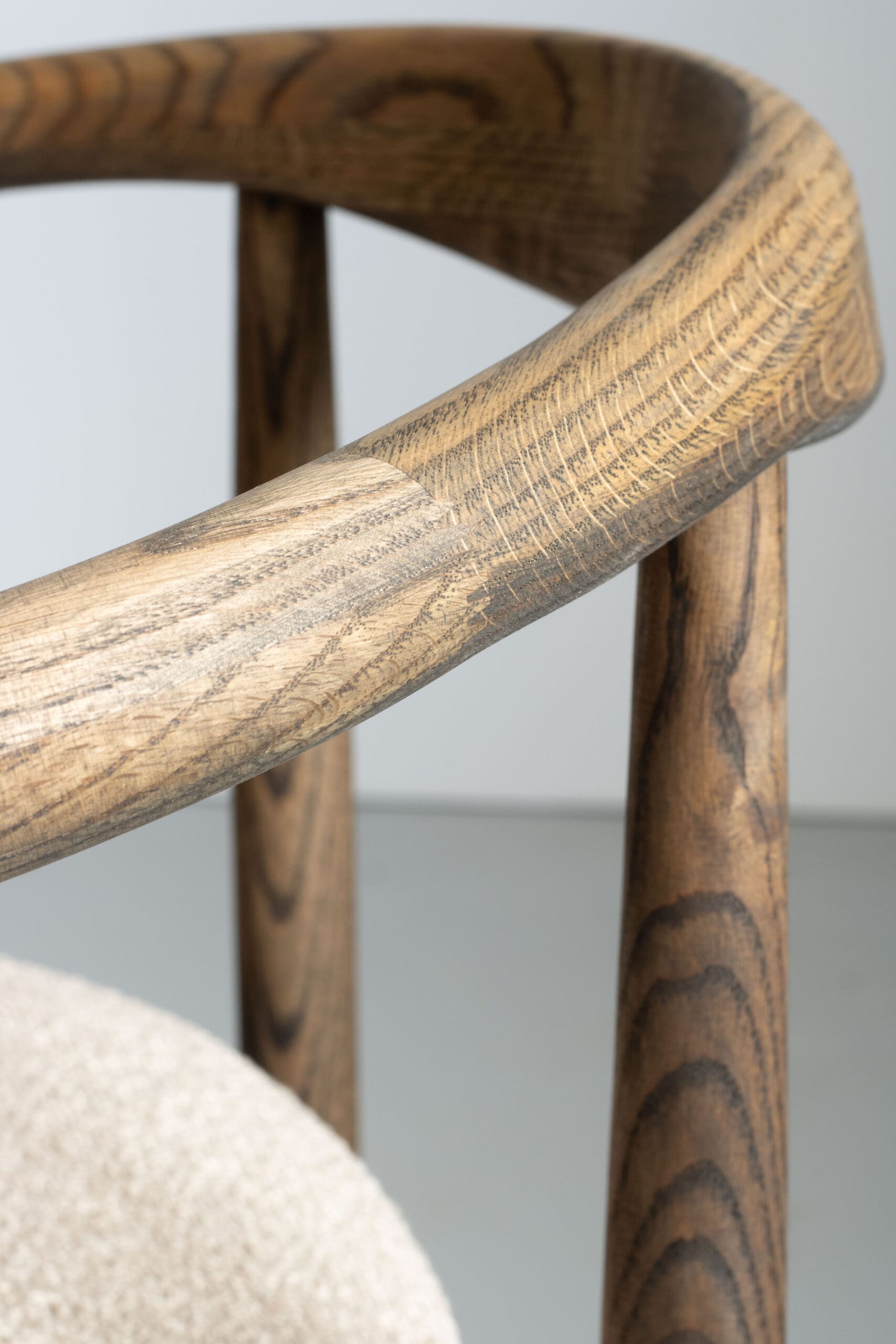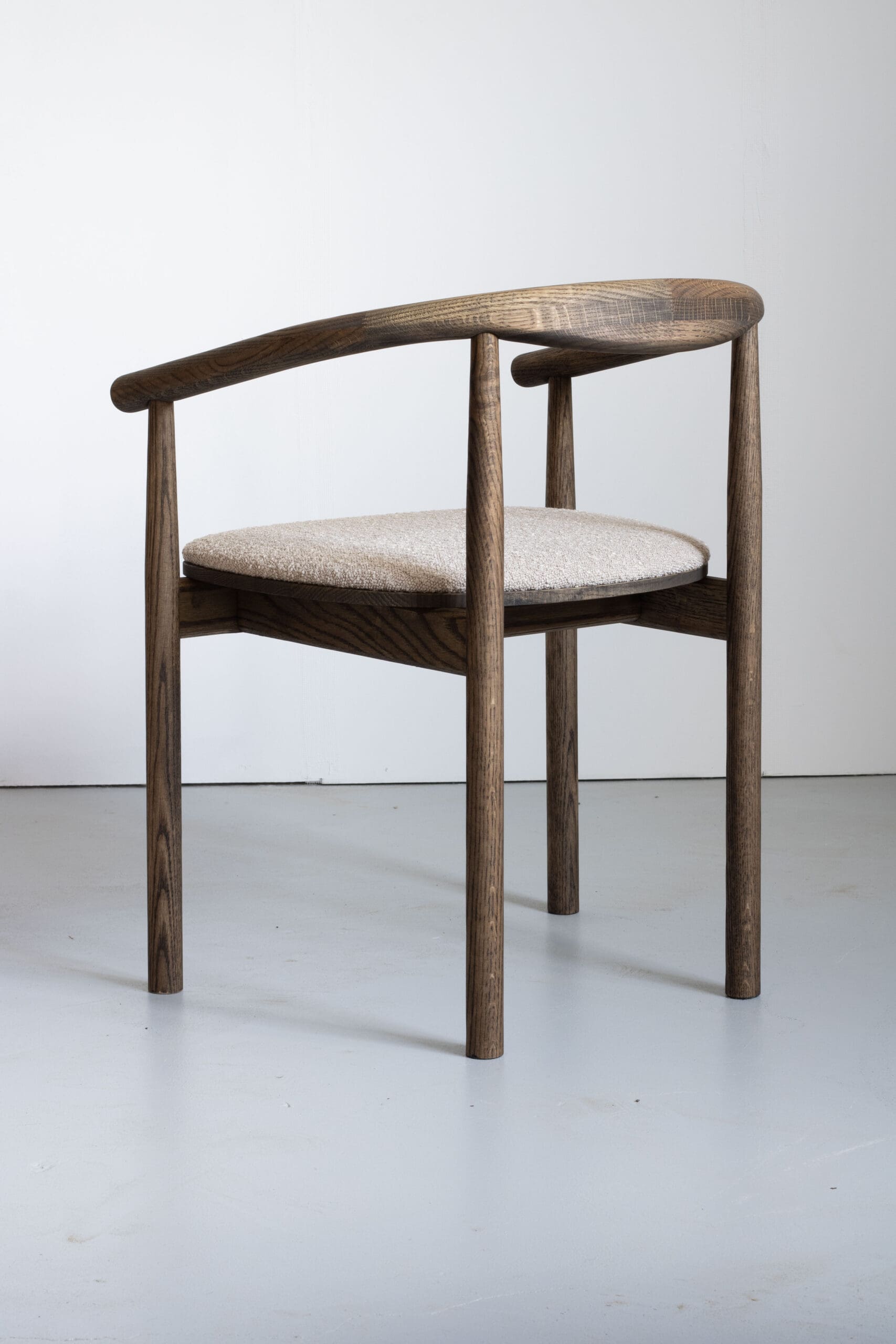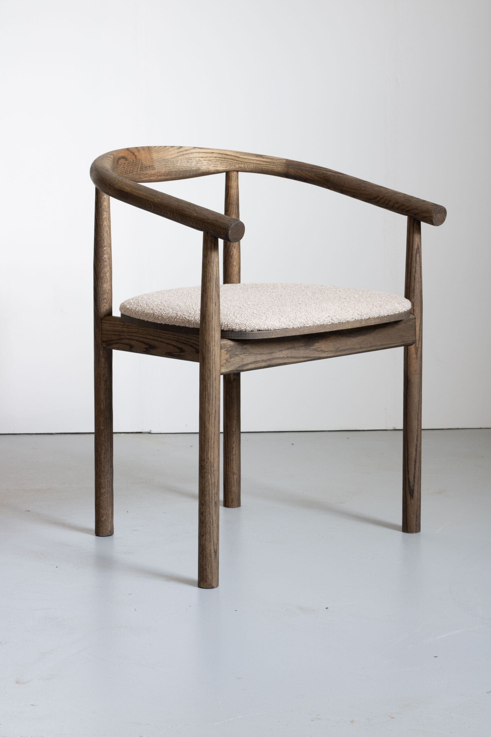 Discover timeless elegance with this designer chair in smoked wood and soft beige bouclé fabric.