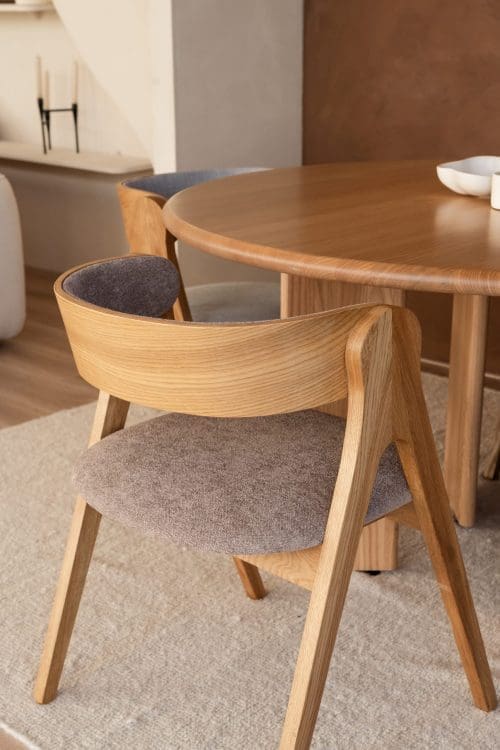 Eikenhouten stoel harmonieuze mix van Japandi en Scandinavische stijl.