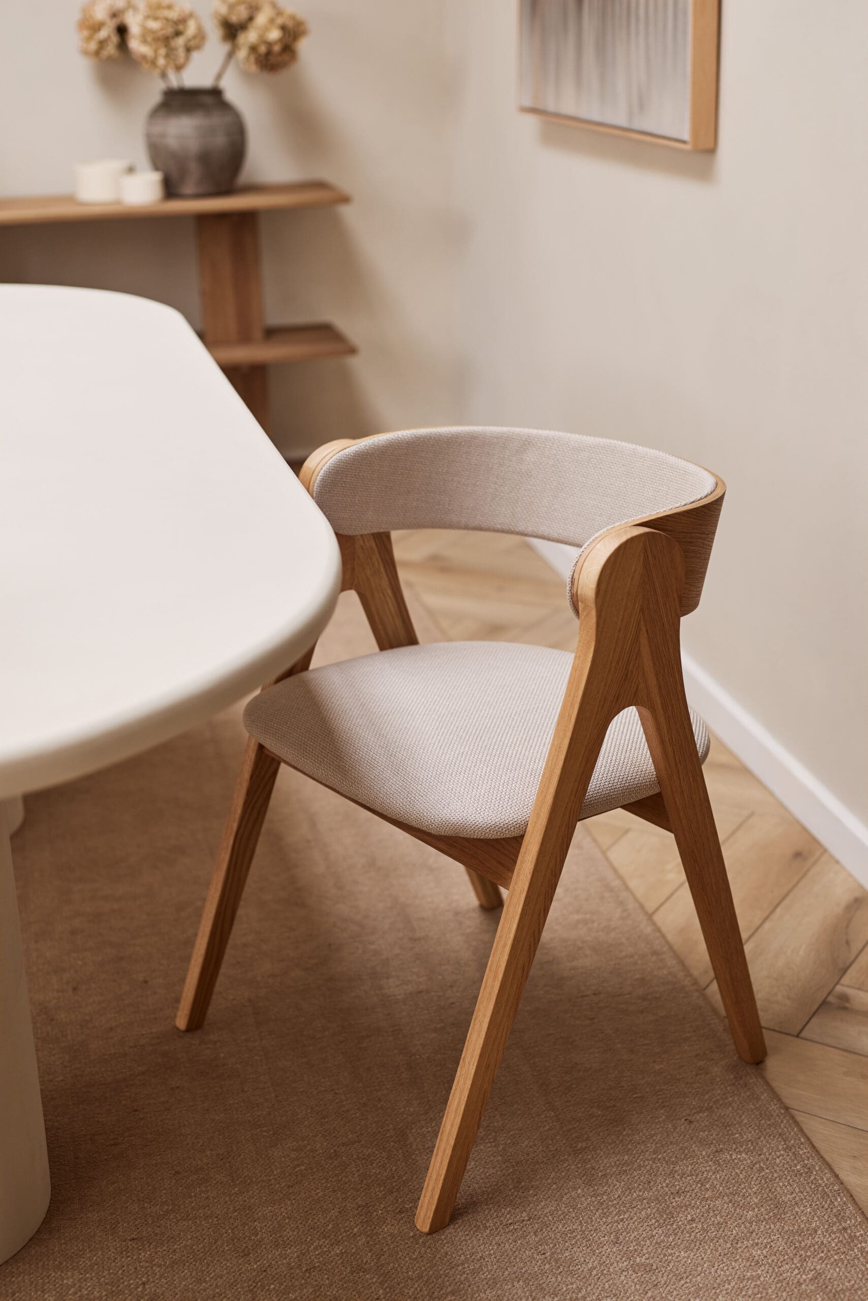 Transformeer jouw ruimte met onze prachtige eikenhouten stoelen, geïnspireerd op de harmonieuze mix van Japandi en Scandinavische stijl. Een perfect evenwicht tussen elegantie en eenvoud, deze stoelen brengen warmte en verfijning in elk interieur. Het prachtige minimalistische design van de ‘Anna’ stoelen is in staat om elk interieur om te toveren tot een oase van rust en kalmte. Het combineert op vakkundige wijze zachte kleuren in de stof en afwerking met een ergonomische constructie die zorgt voor comfortabele zit- en rugsteun.