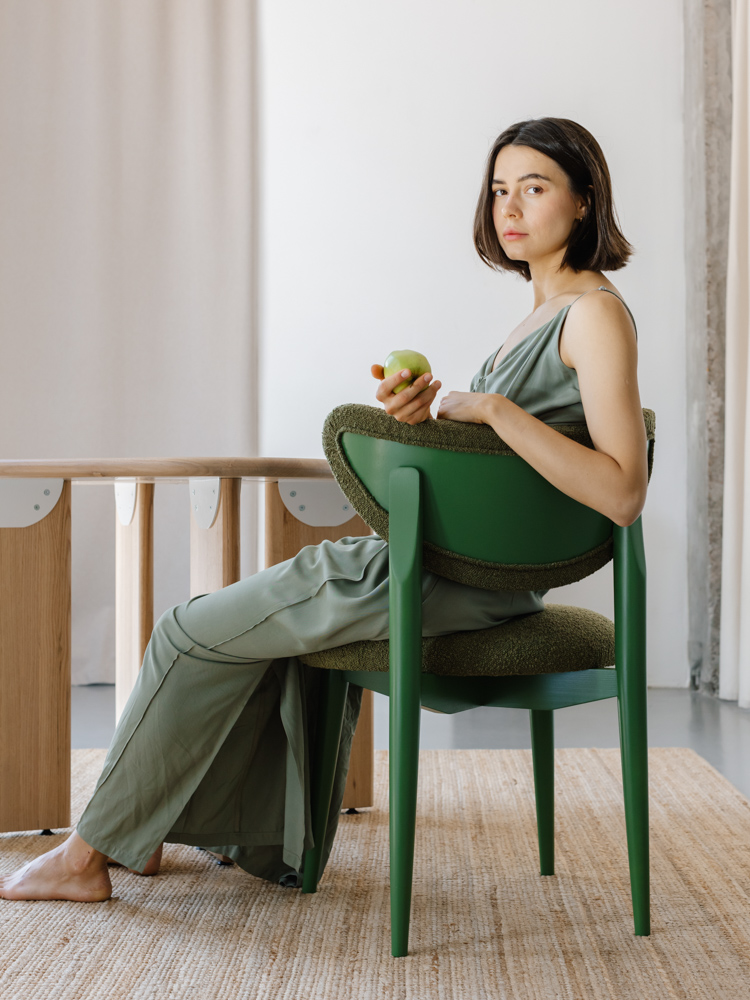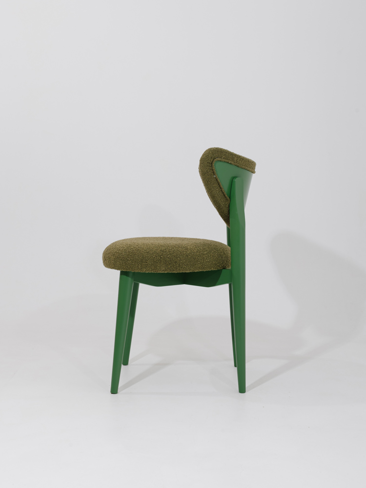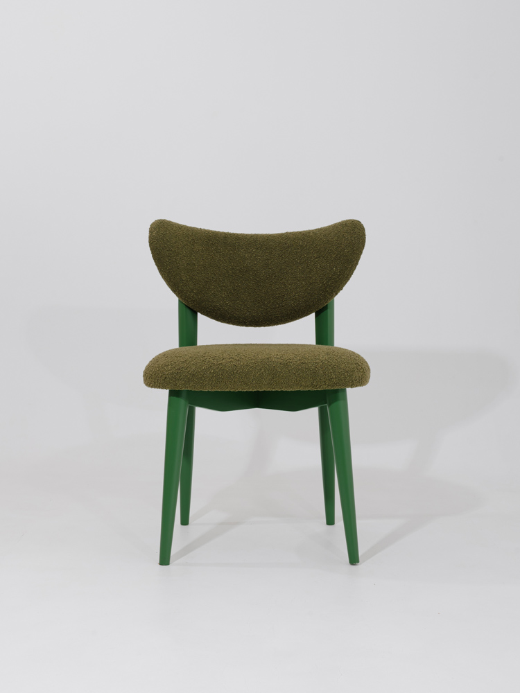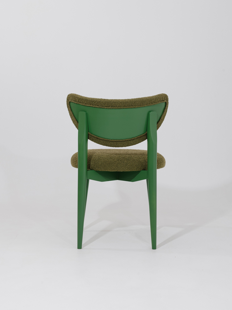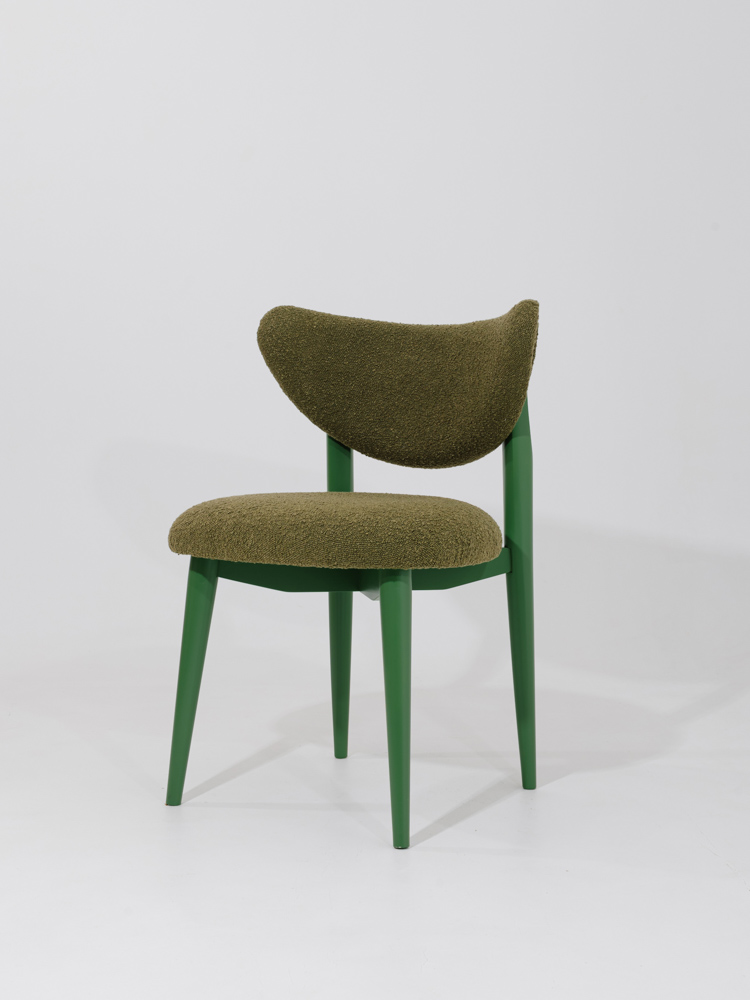 Ontdek de elegantie van volledig groen. Onze designer eetkamerstoel Bloom met maanvormige rugleuning combineert tijdloos comfort met een unieke, organische vorm.