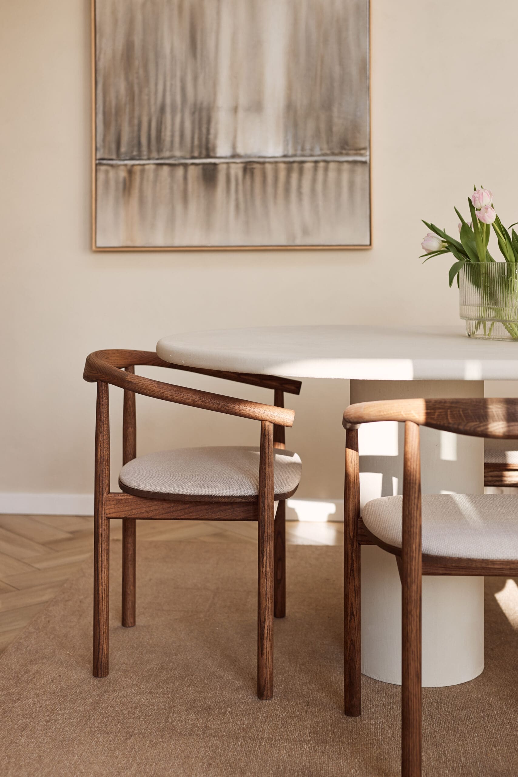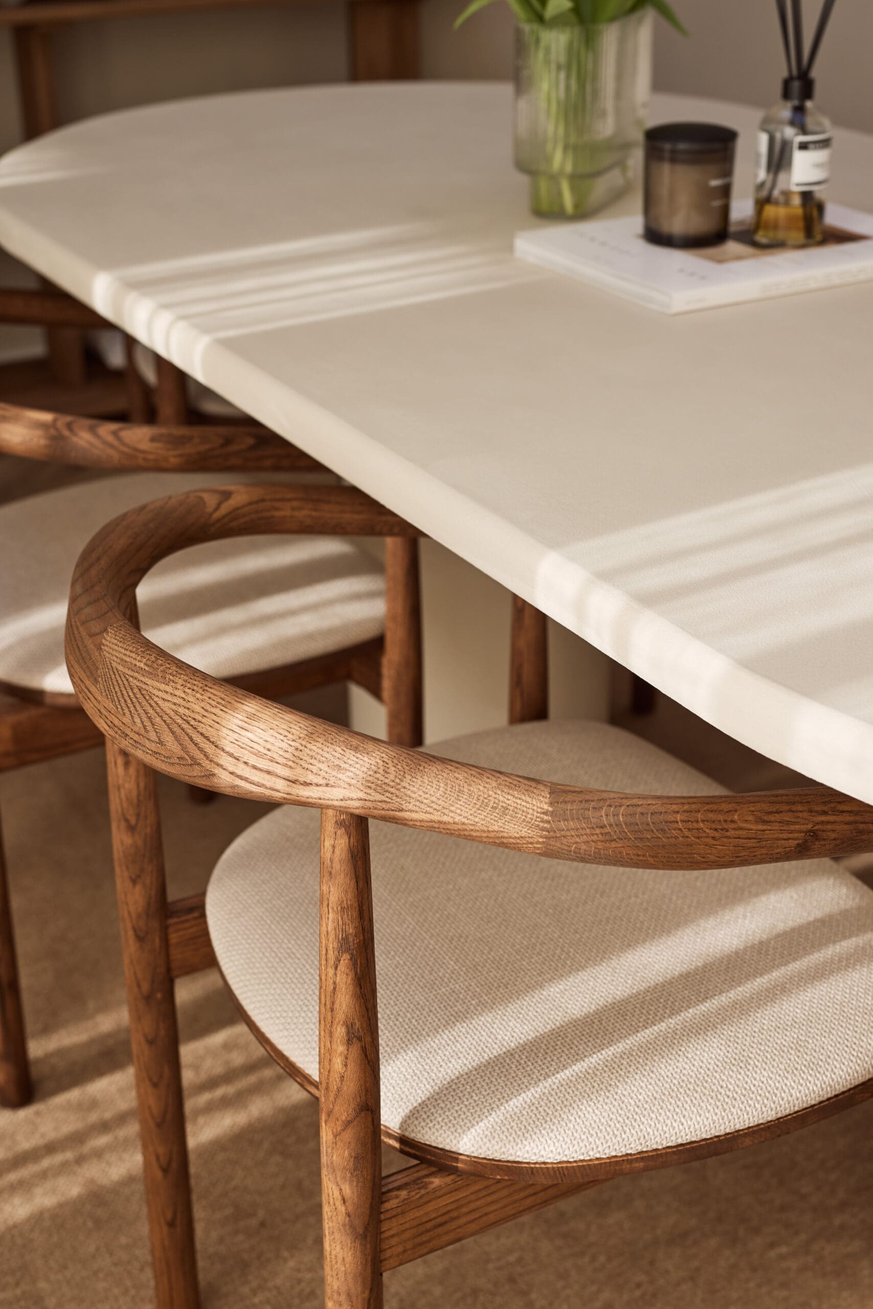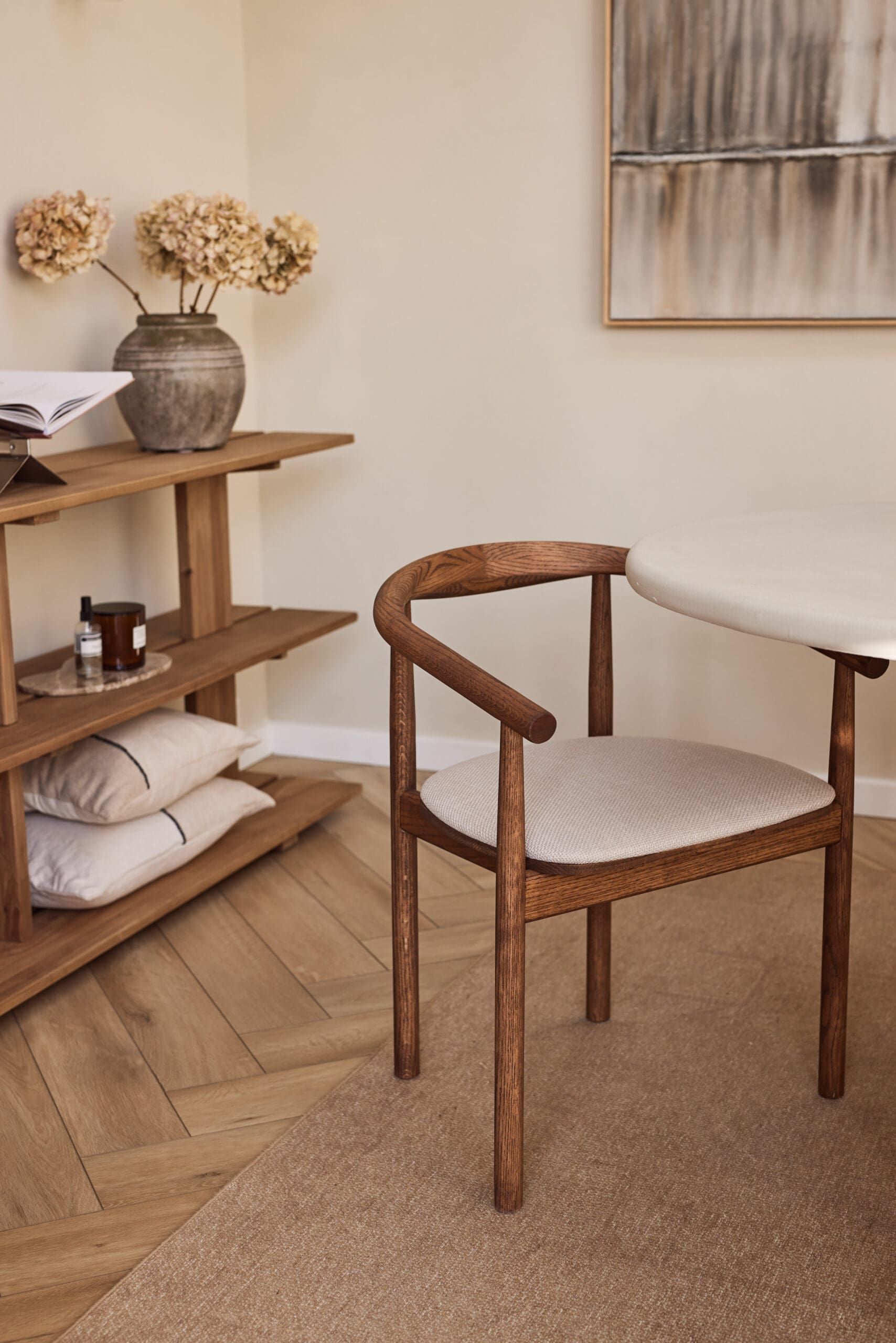 Transformeer jouw ruimte met onze prachtige eikenhouten stoelen, geïnspireerd op de harmonieuze mix van Japandi en Scandinavische stijl. Een perfect evenwicht tussen elegantie en eenvoud, deze stoelen brengen warmte en verfijning in elk interieur. Het prachtige minimalistische design van de ‘Calm’ stoelen is in staat om elk interieur om te toveren tot een oase van rust en kalmte. Gemaakt van eikenhout. Het combineert op vakkundige wijze zachte kleuren in de stof en afwerking met een ergonomische constructie die zorgt voor comfortabele zit- en rugsteun.