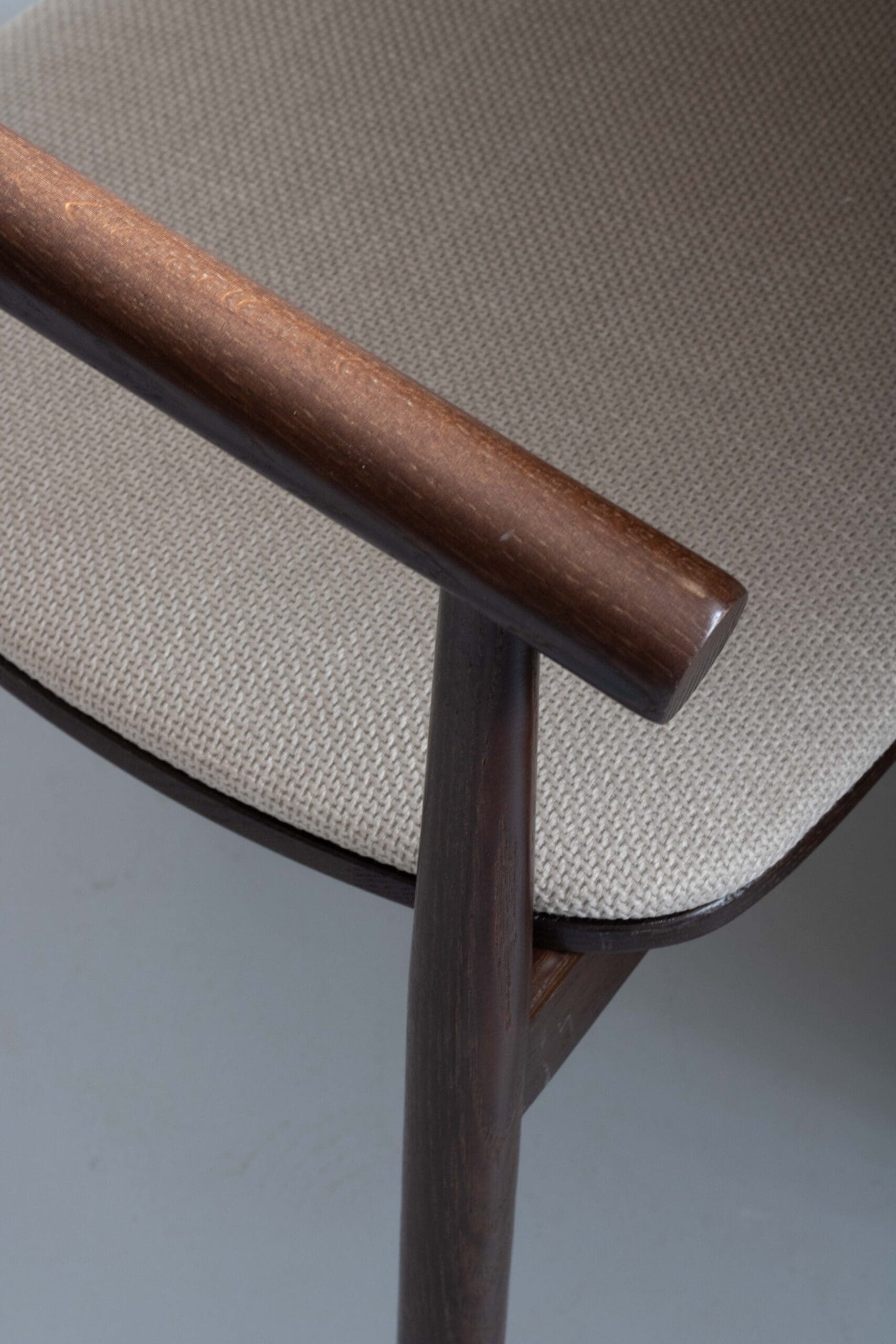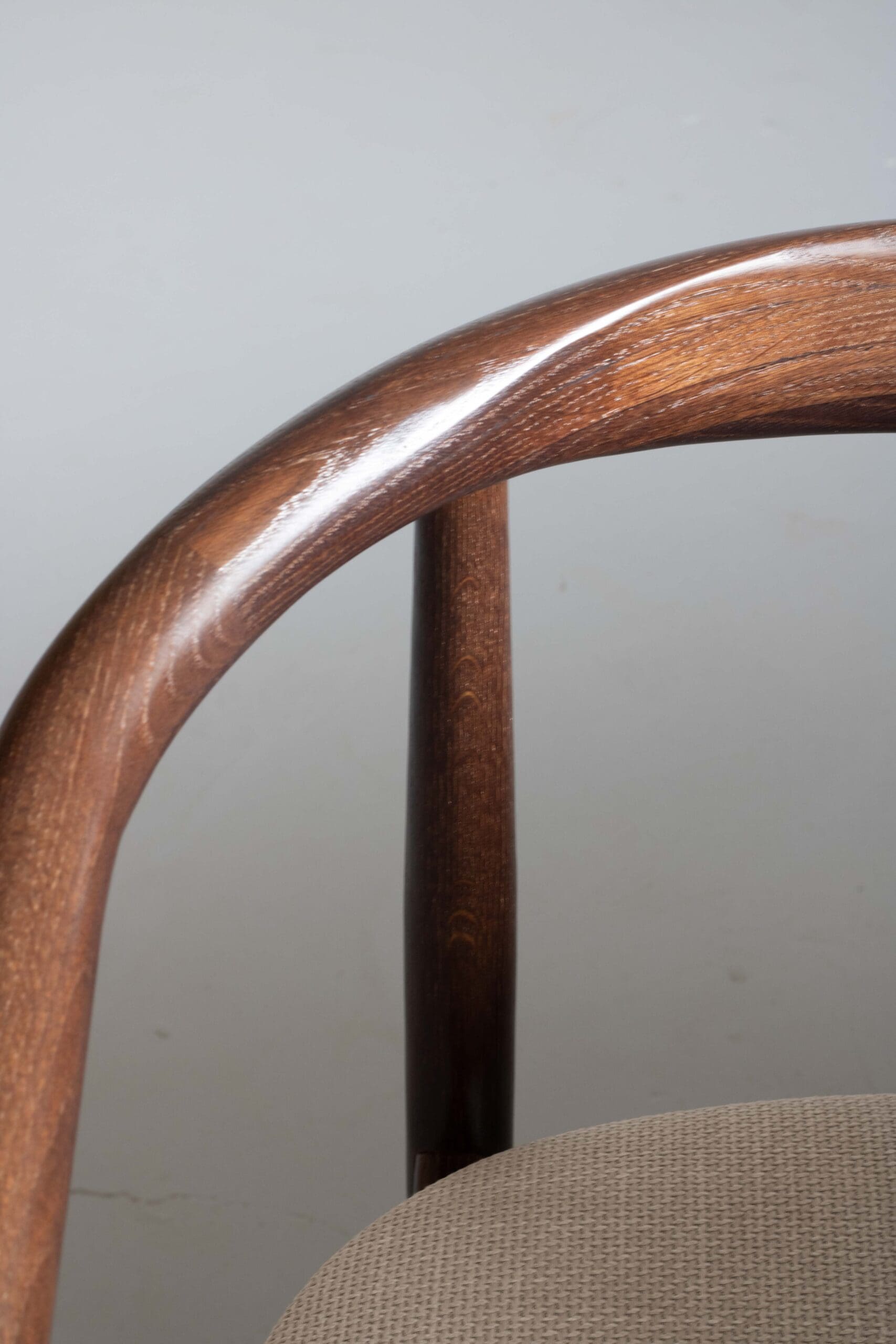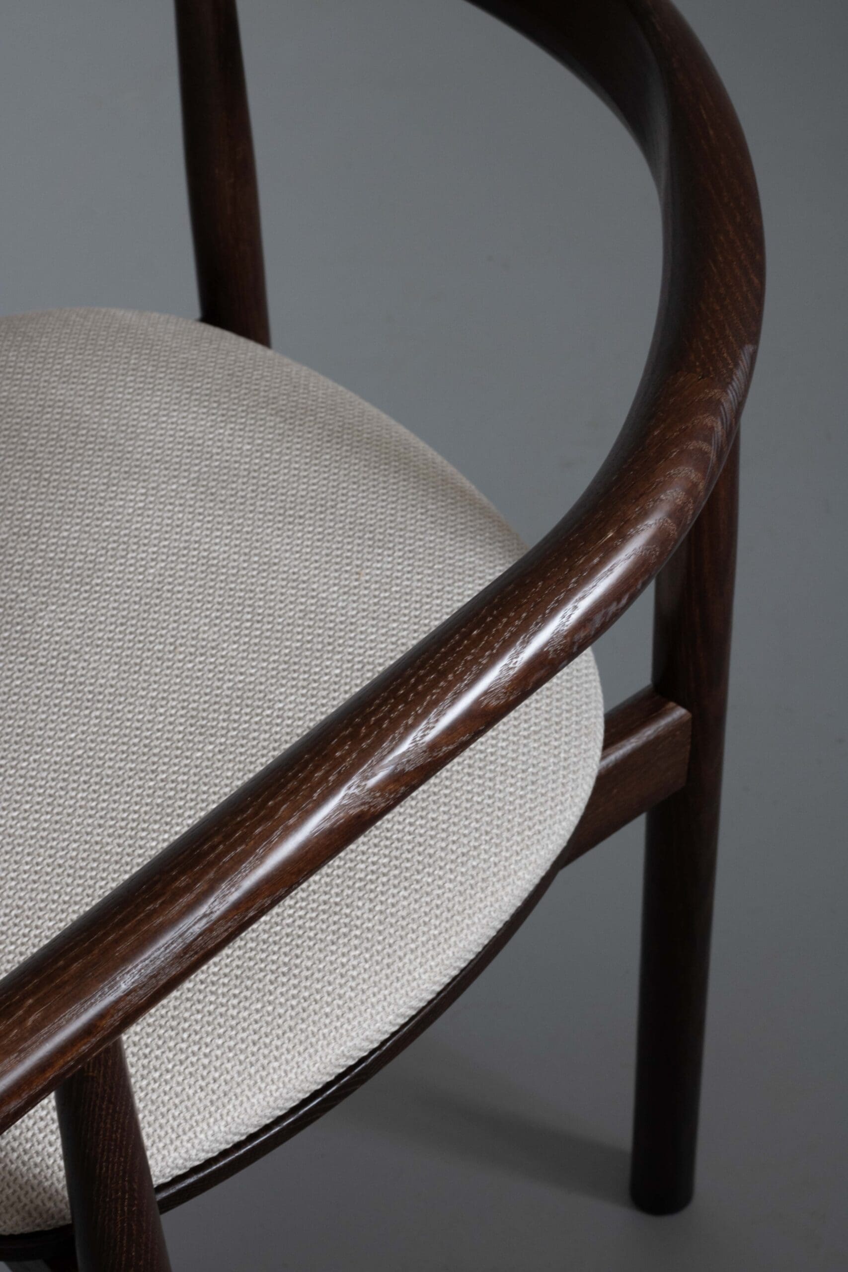 Stijlvolle design stoelen in walnoot olie met een laklaag en creme stof. Perfect voor een modern interieur met een warme uitstraling. Gemaakt van hoogwaardig eikenhout.