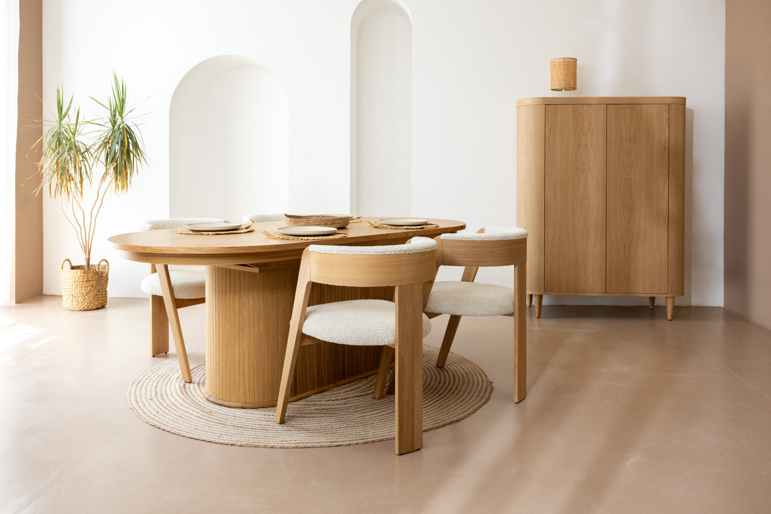 Kleur: Geolied naturel eikenhout met beige bouclé stof