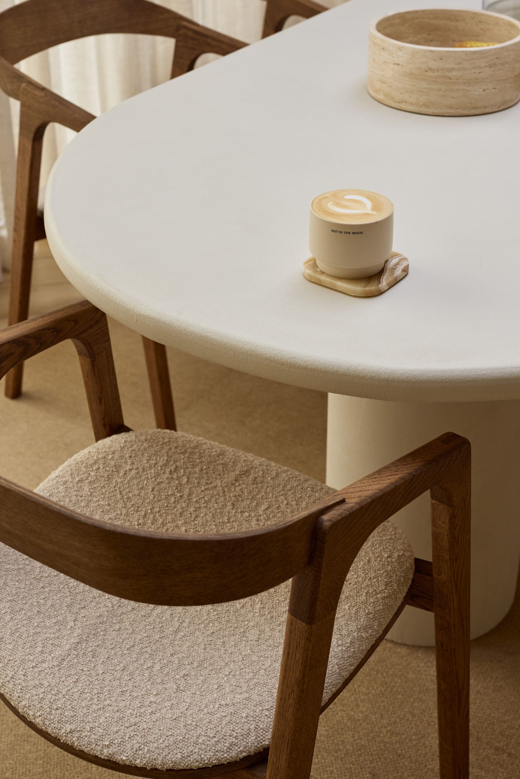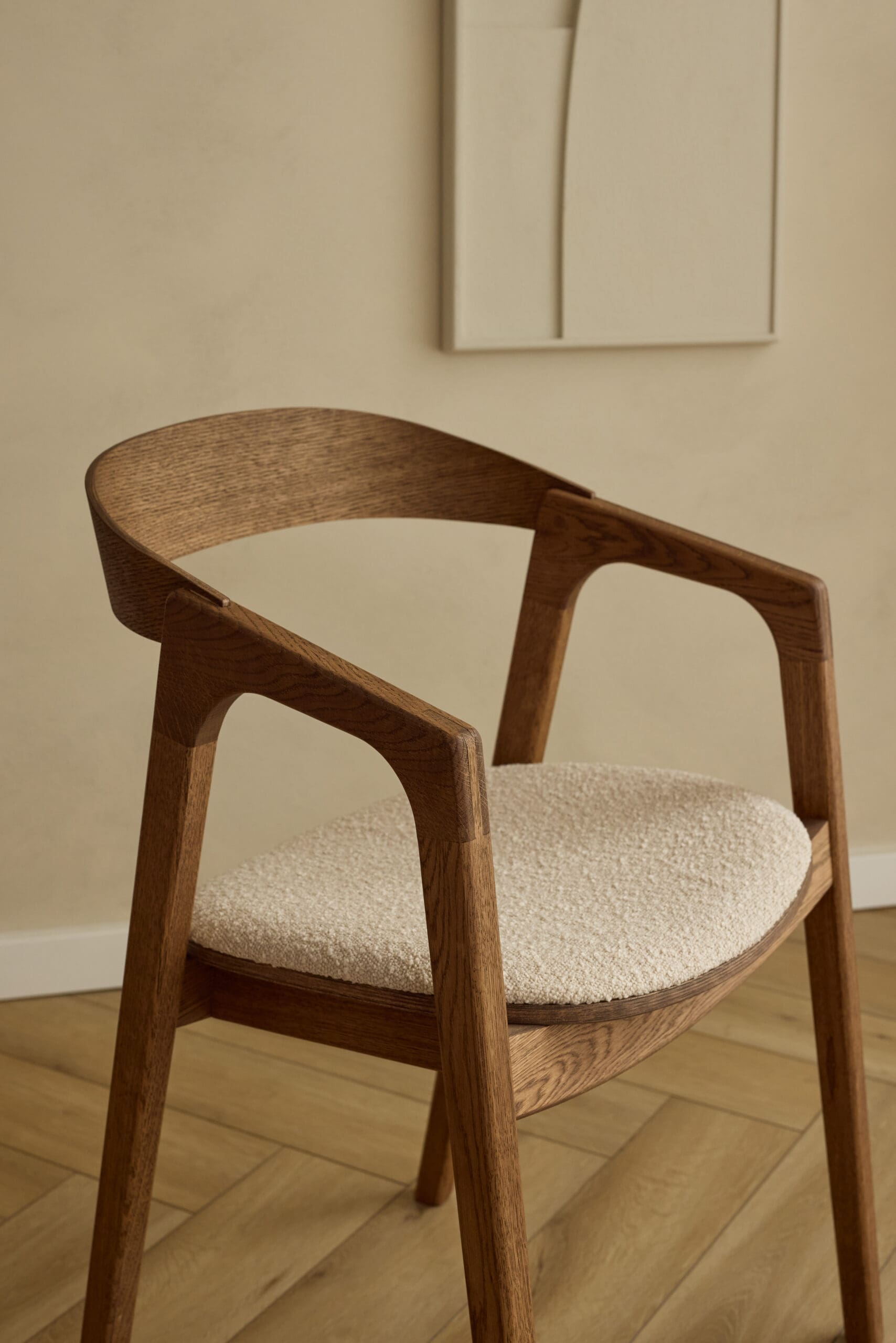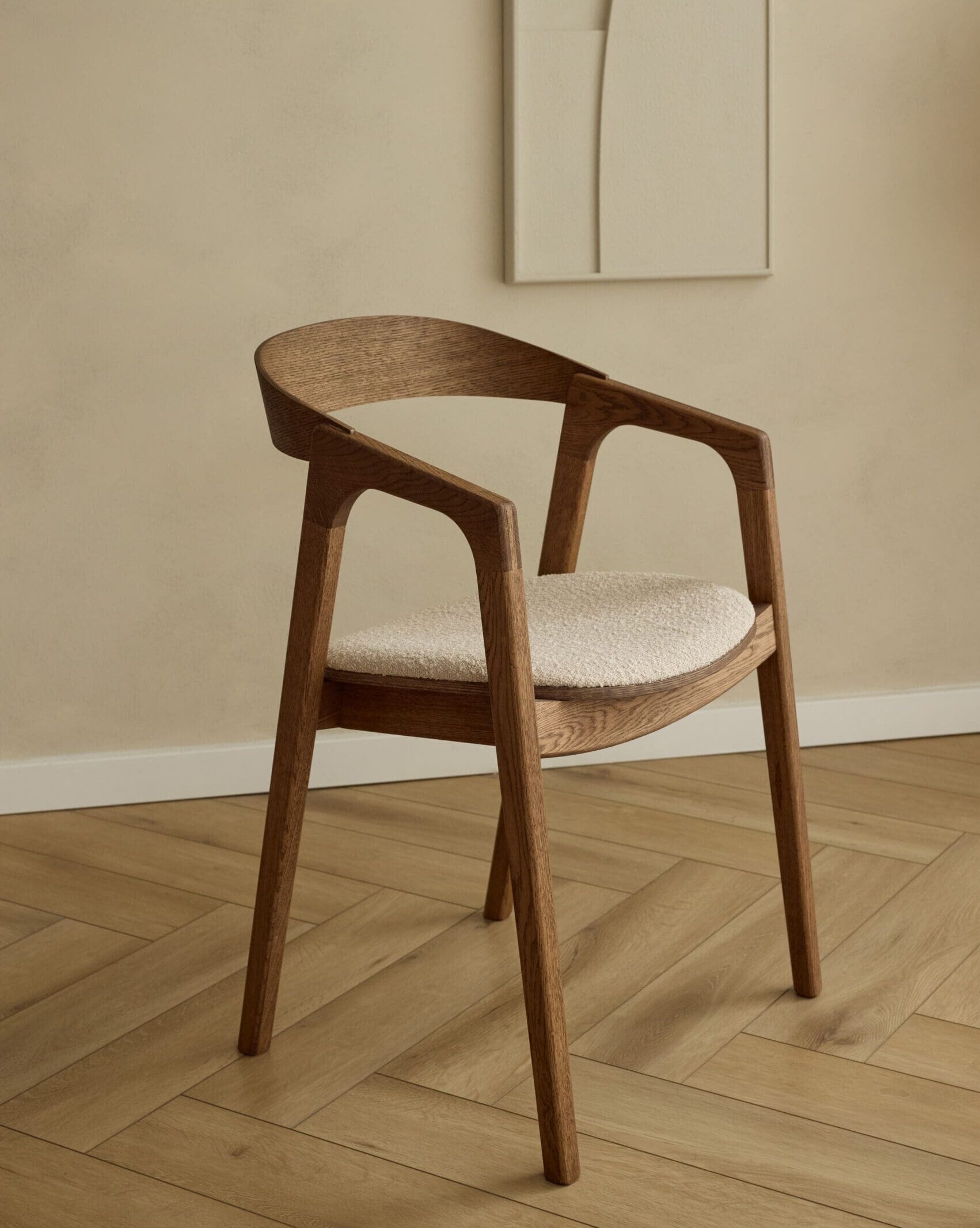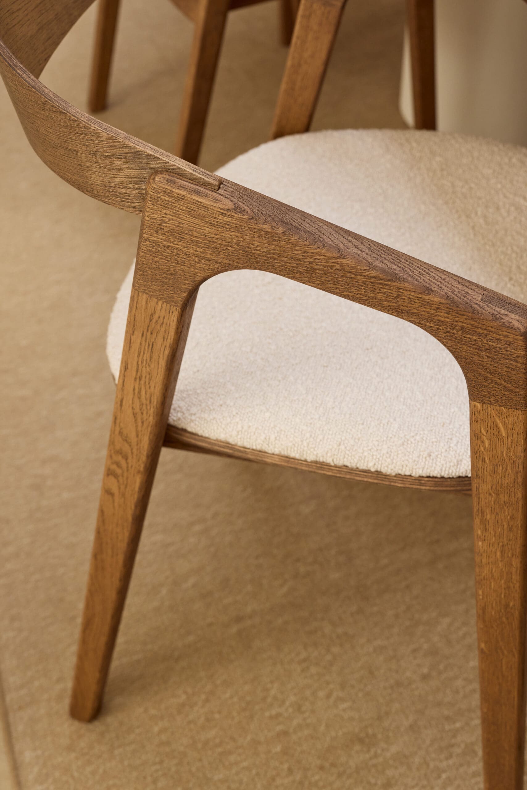 Bekijk het unieke design van de eetkamerstoel Maral in brons eikenhout met een lichte beige boucle stof.