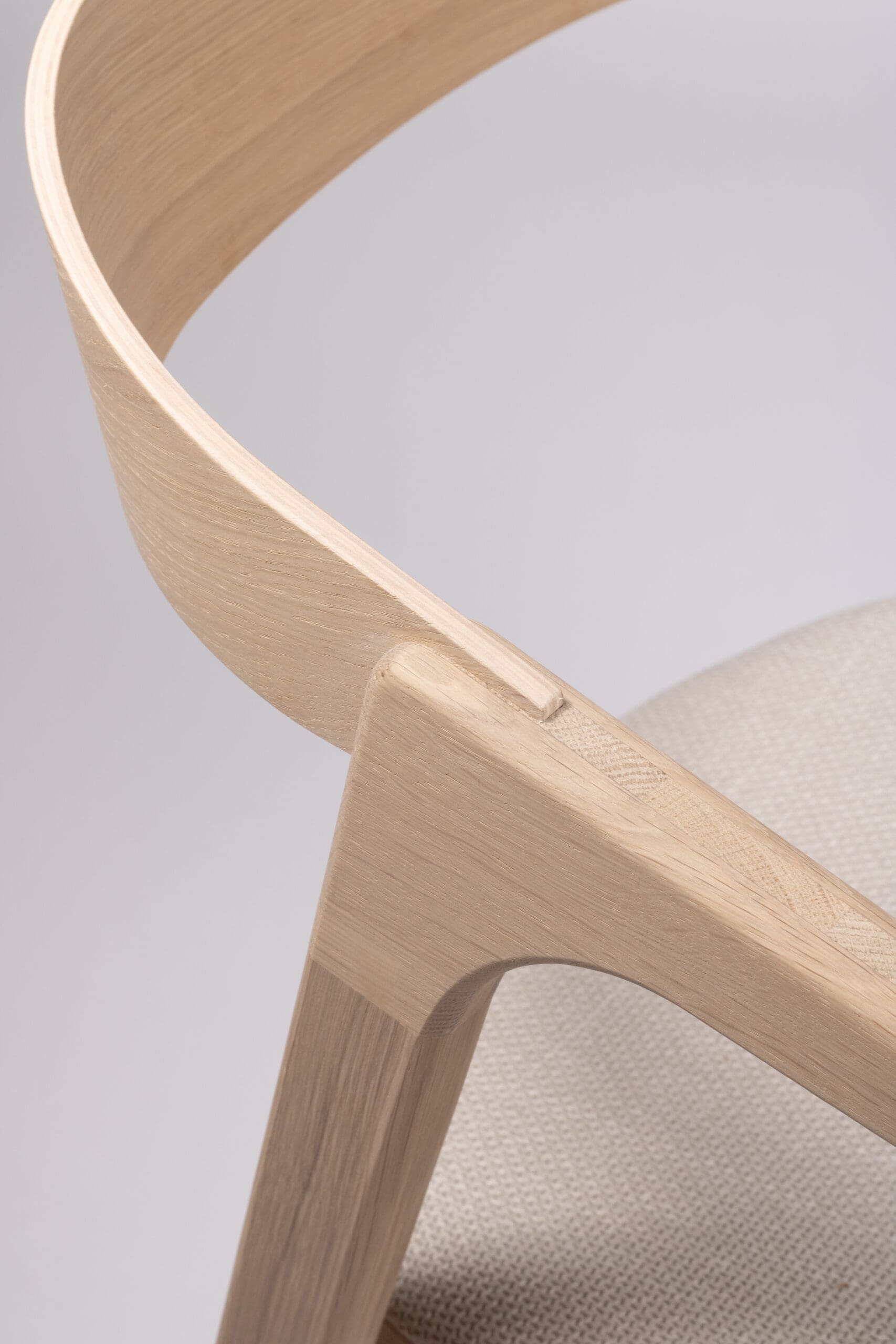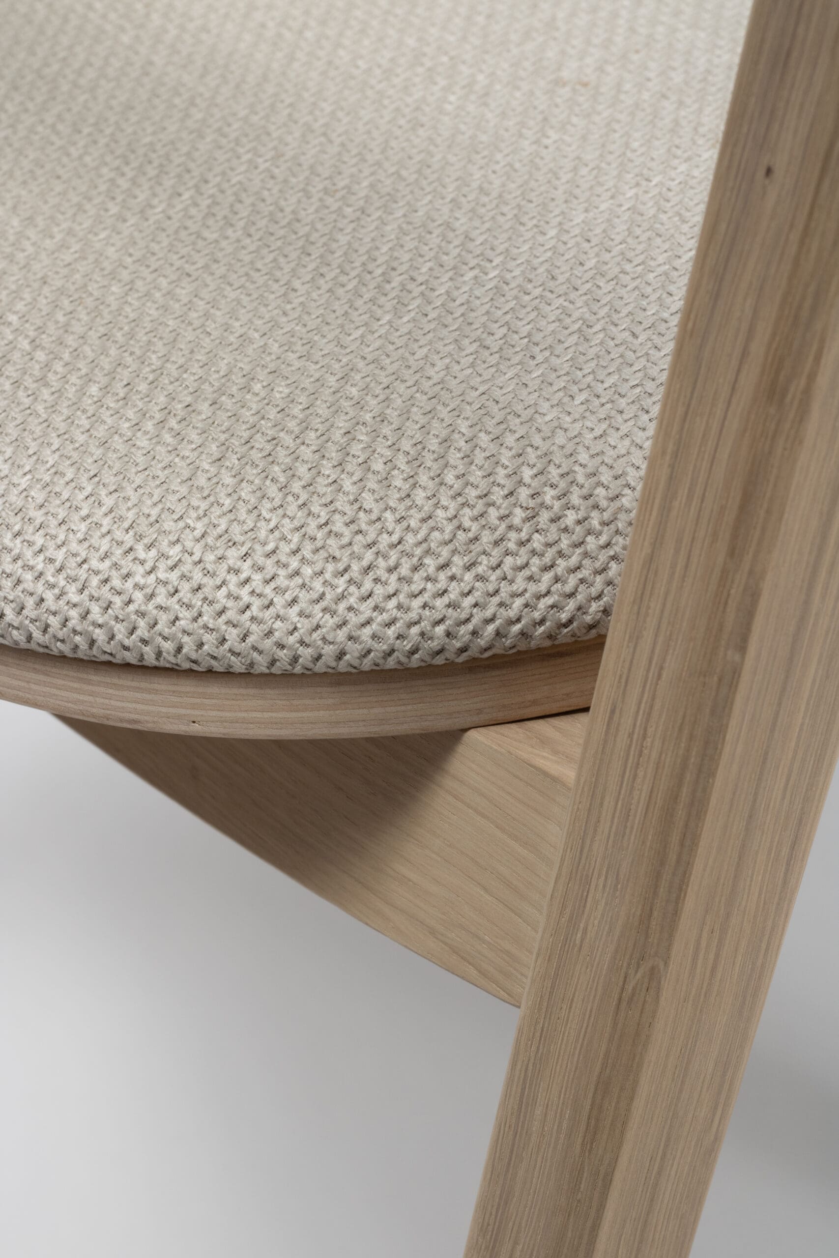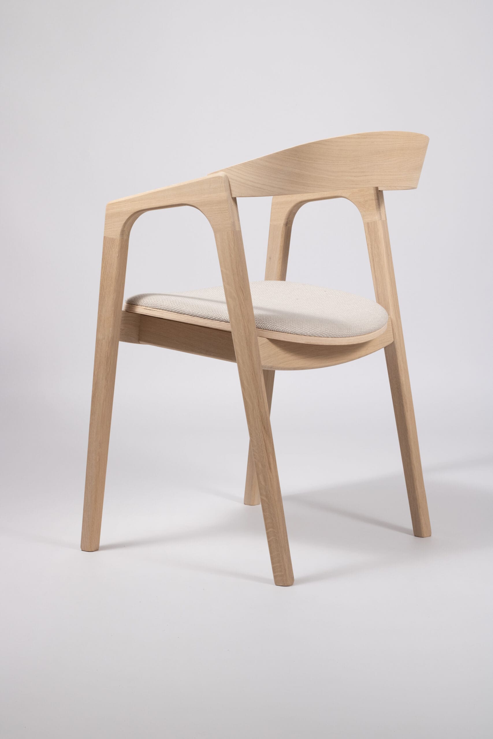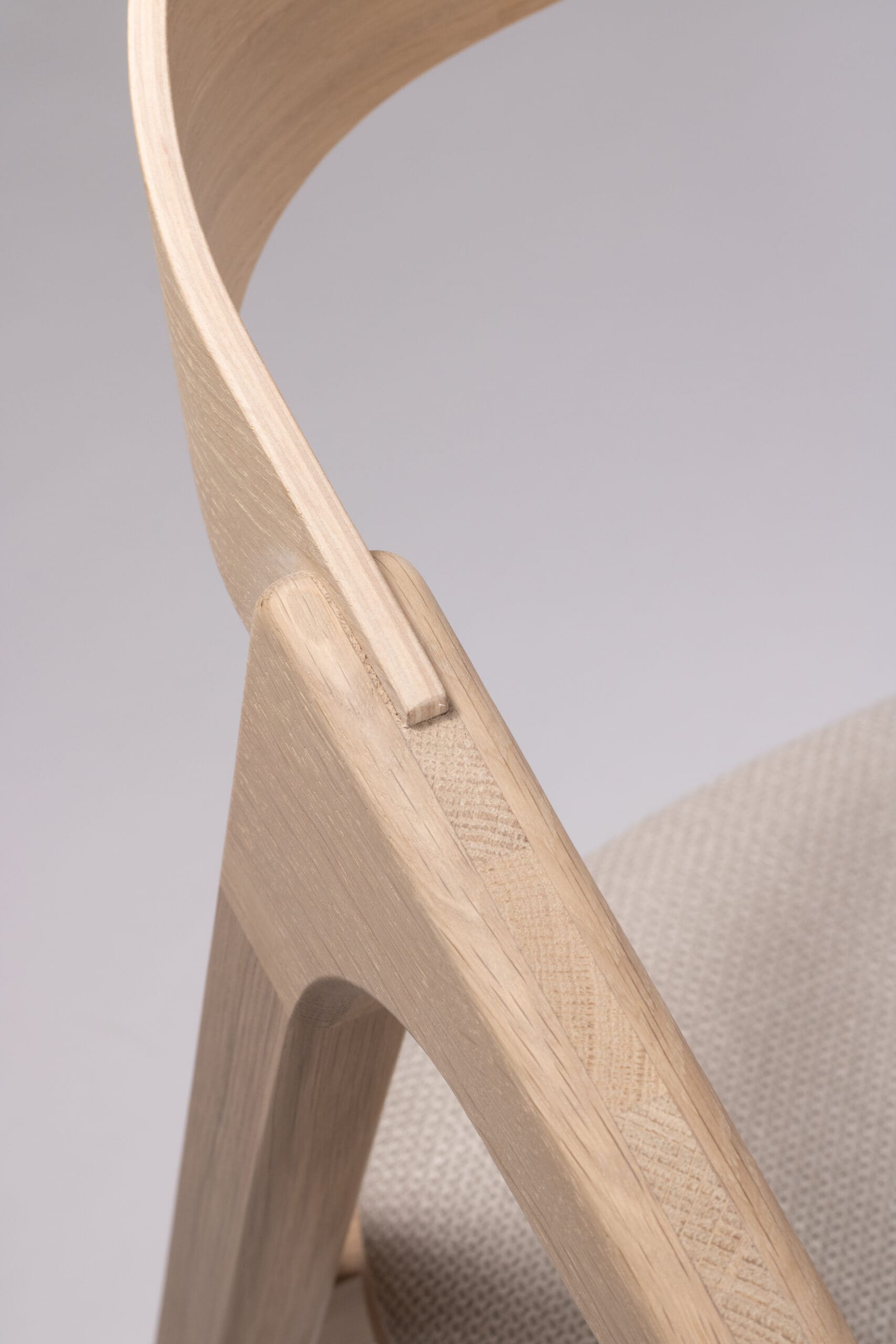 Bekijk het unieke design van de eetkamerstoel Maral in wit eikenhout met een creme stof.