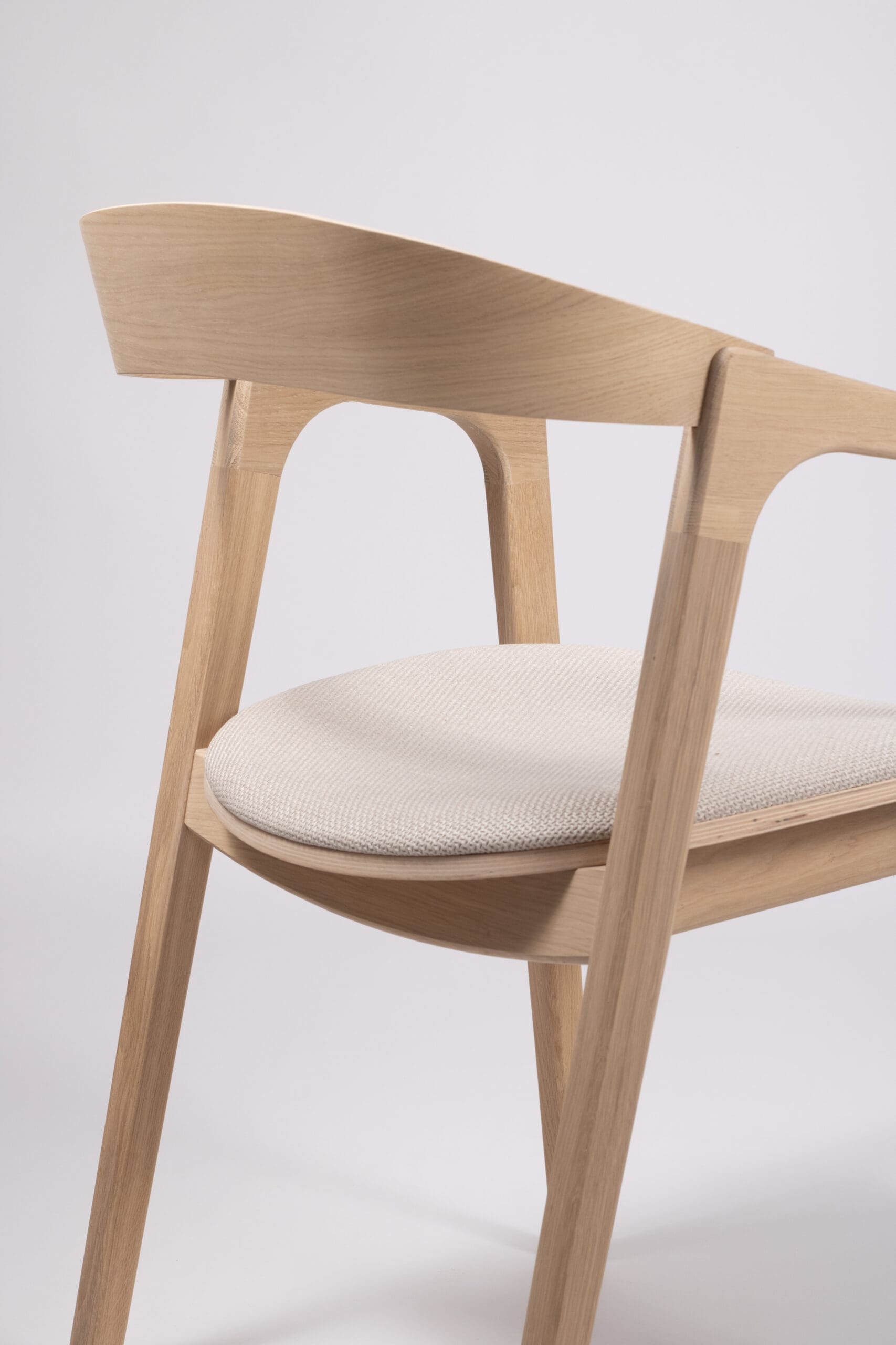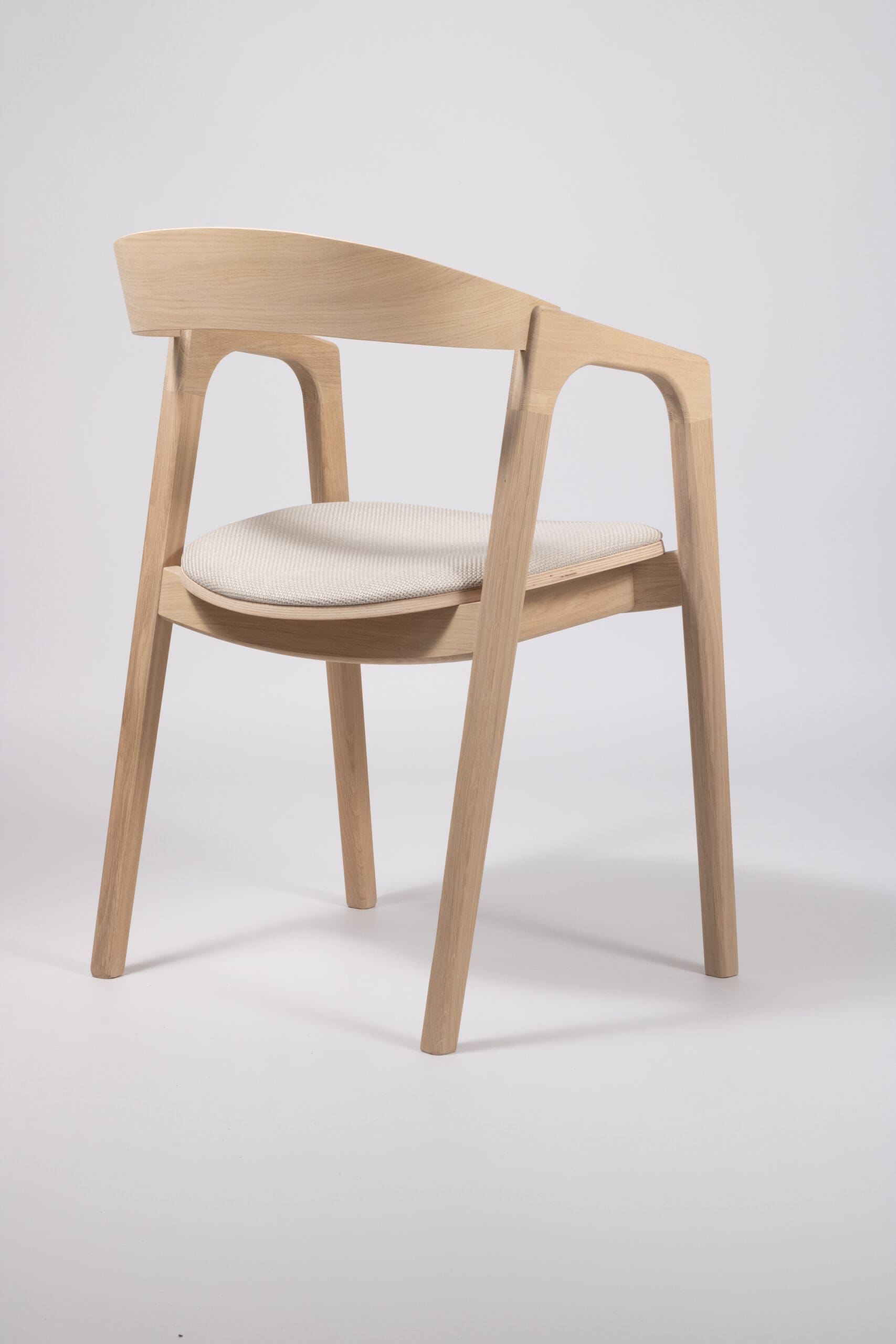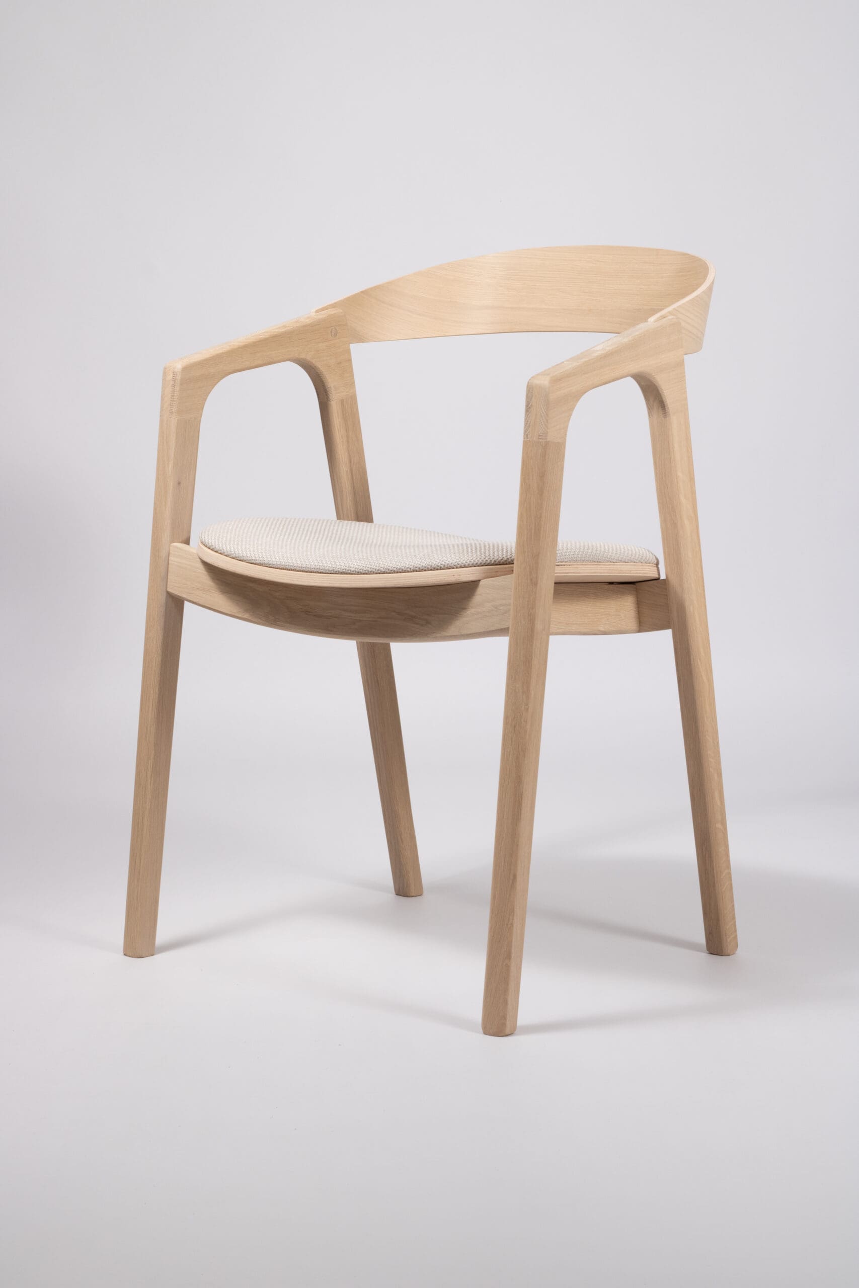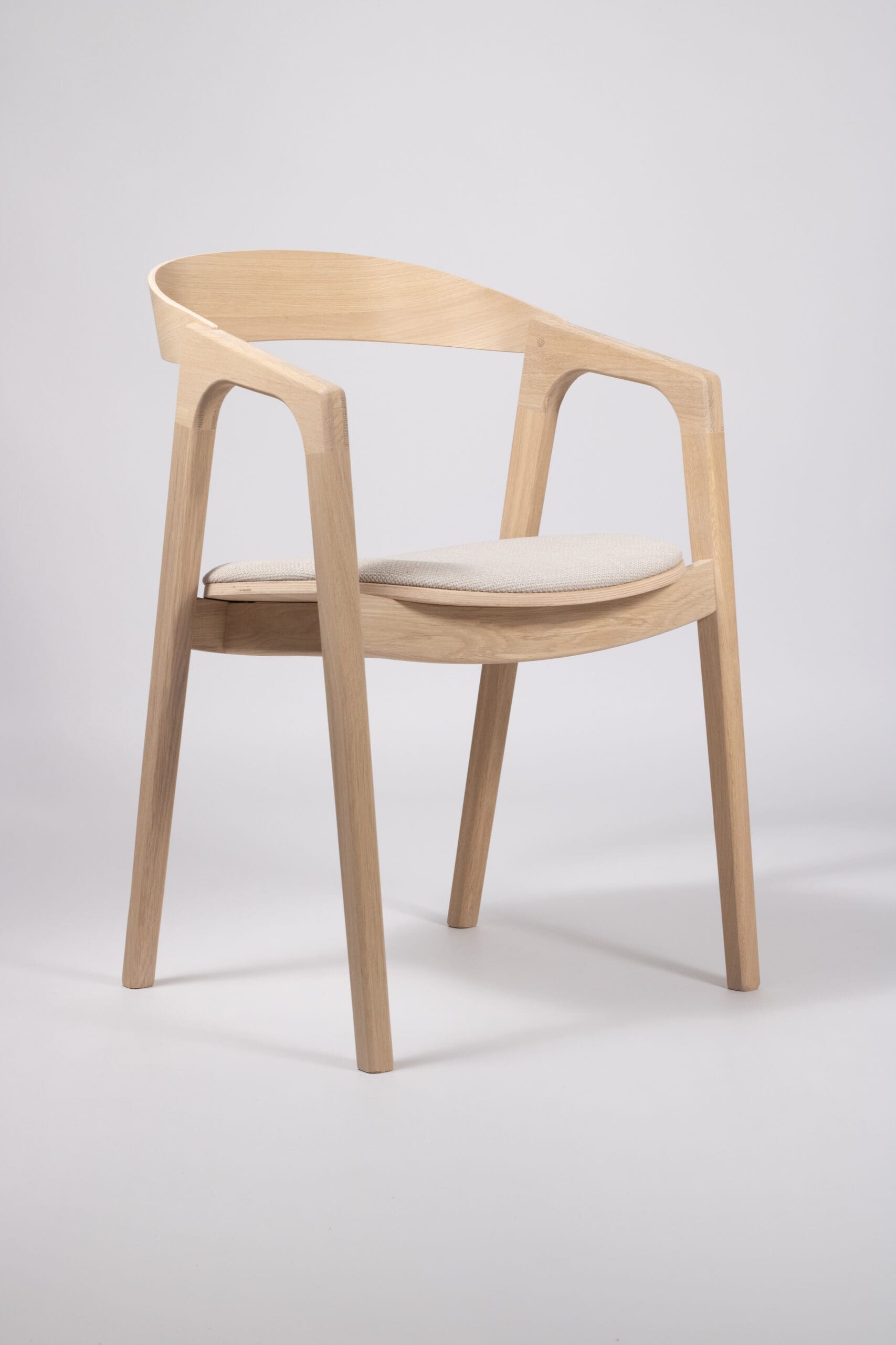 Bekijk het unieke design van de eetkamerstoel Maral in wit eikenhout met een creme stof.
