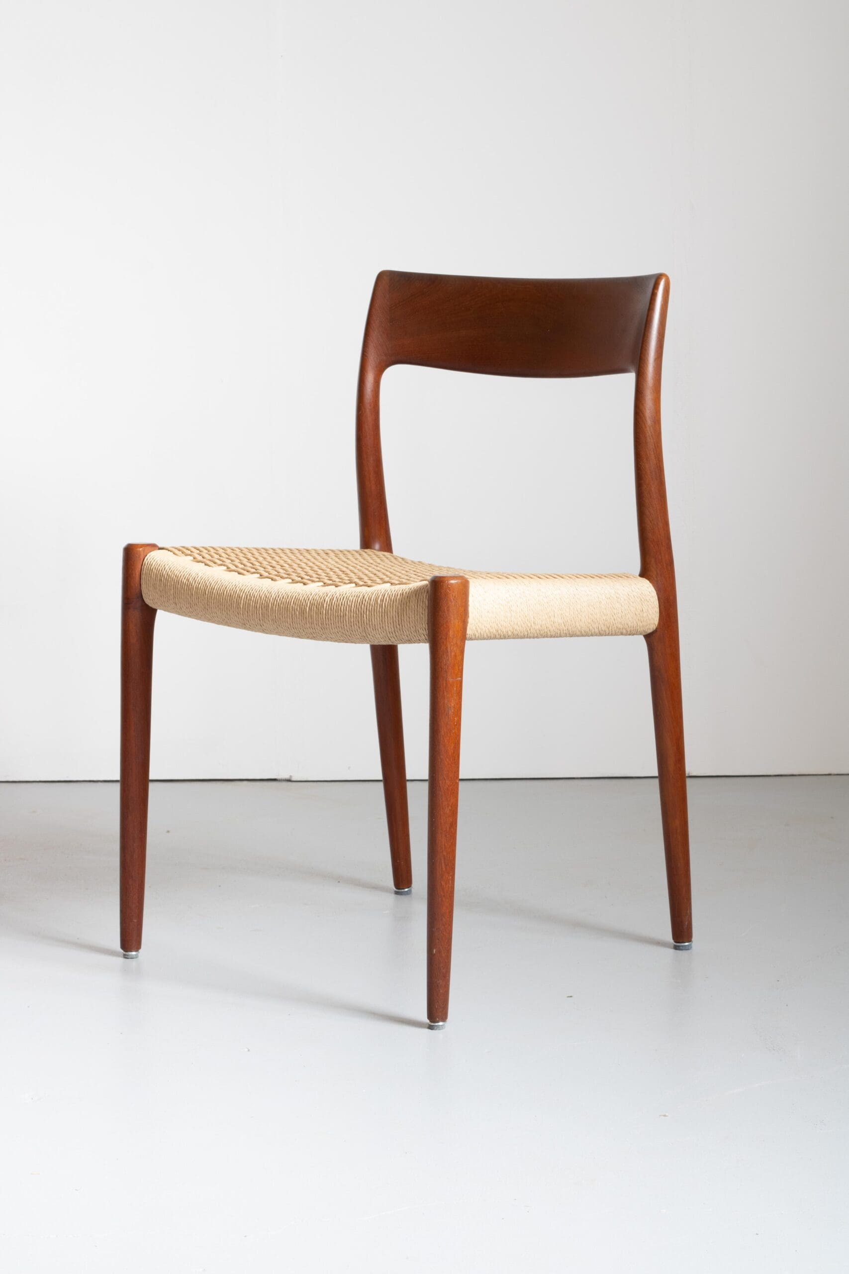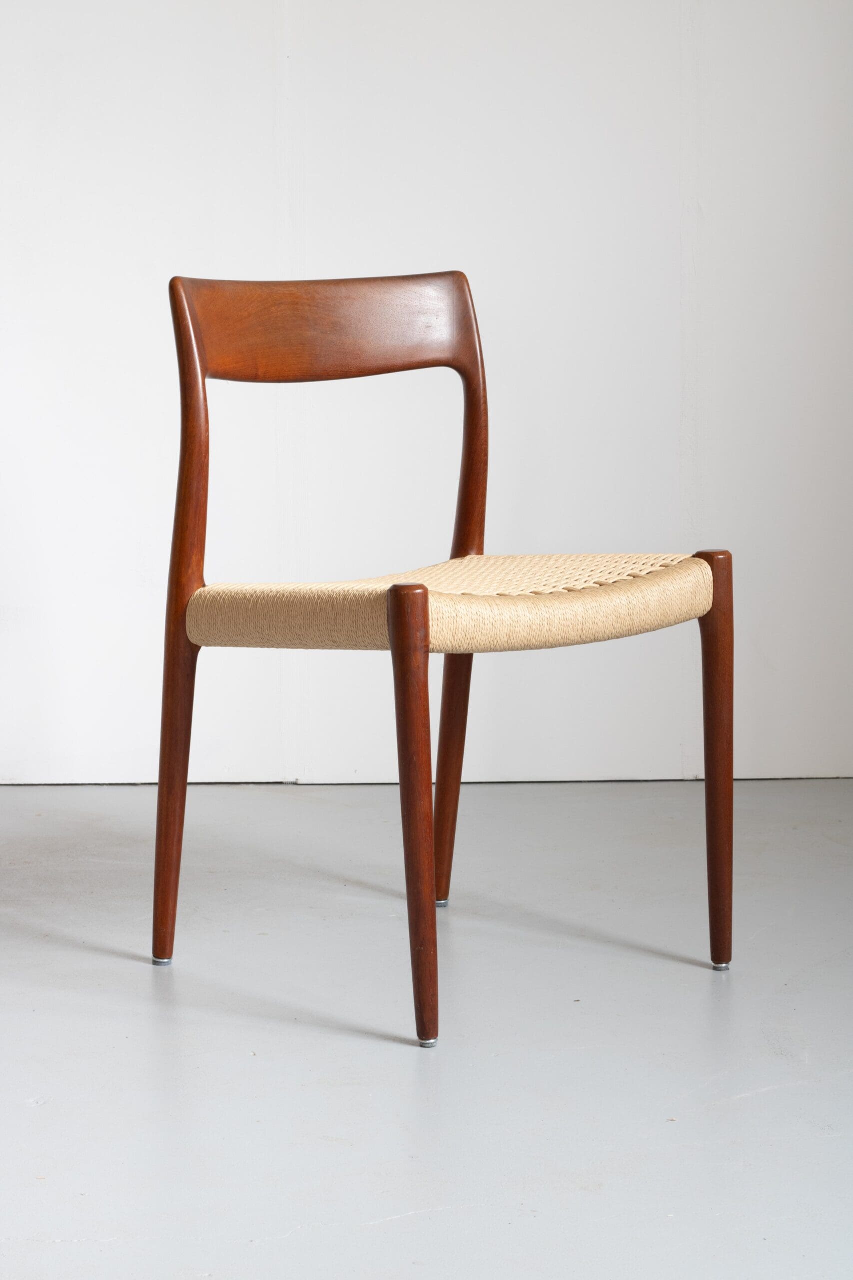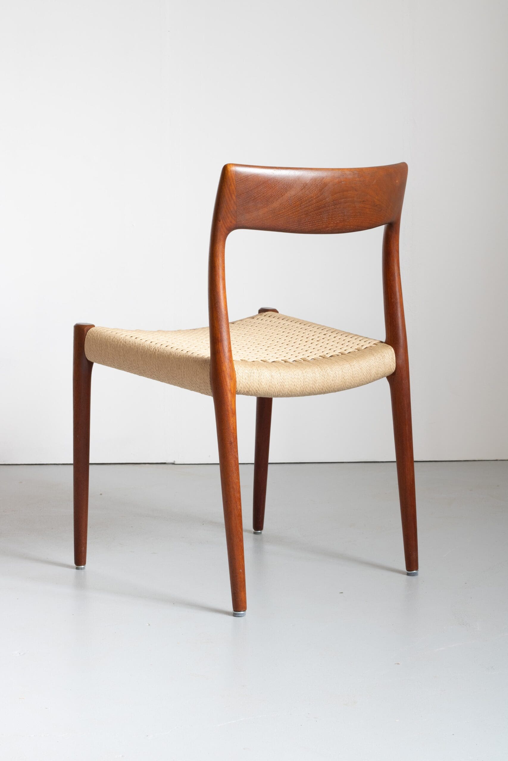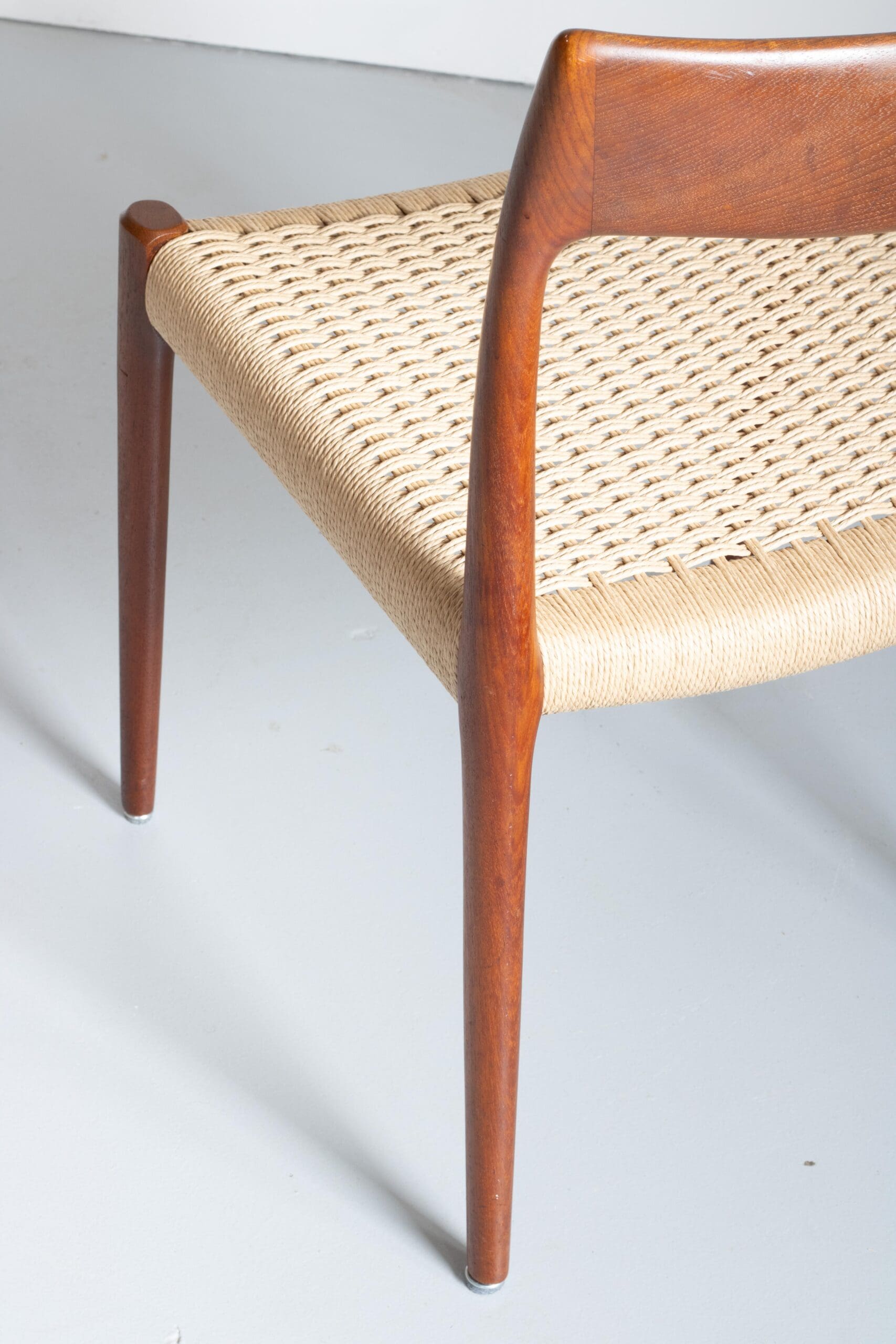 Prachtige vintage stoelen van Niels Otto Møller model 77. Alle stoelen zijn in top conditie, alle frames zijn opgepoetst. De stoelen zijn uitgevoerd in teakhout met een paper cord zitting.